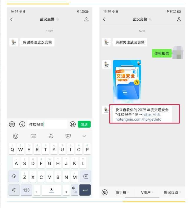 二是进入武汉交警微信服务号,在下方菜单栏中点击【V用户】、【体检报告】;