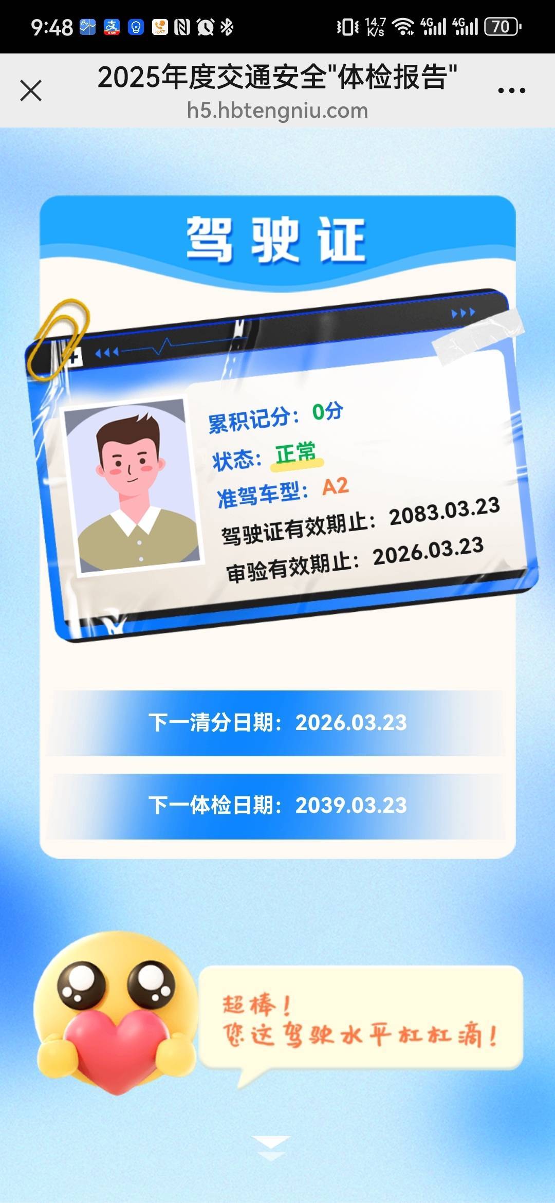 全年0事故,驾驶证累计记分0分,超棒!您这驾驶水平杠杠滴!近日,武汉人的微信朋友圈里,不少人晒出自己的“2025年度交通安全体检报告”。